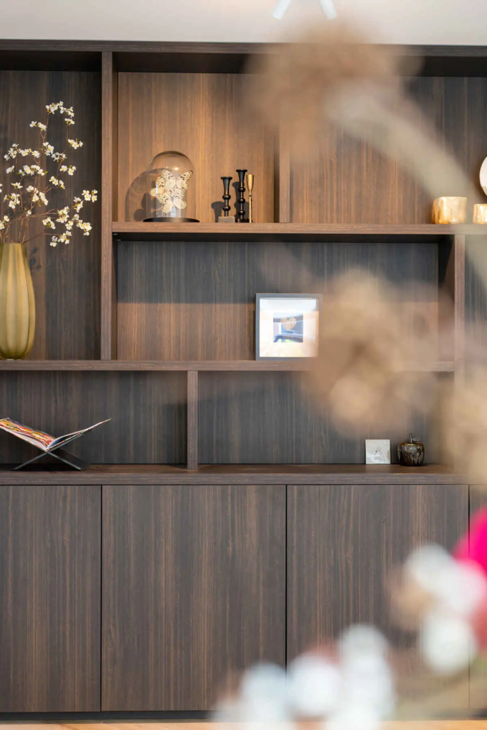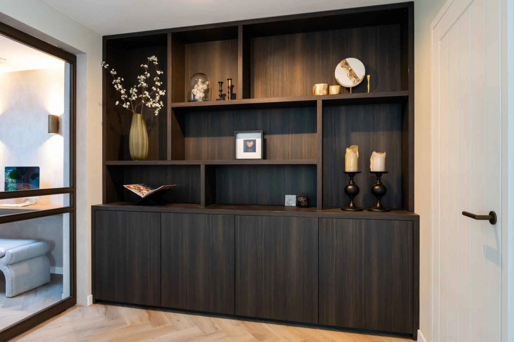 Die warme uitstraling loopt door in het hele huis. “Op veel plekken komt het donkerbruine hout terug”, vertelt ze. Ook het maatwerk dat Van den Bijtel op andere plekken in huis maakte sluit daarop aan: “onze kast is bijvoorbeeld helemaal op maat en dat is dan dezelfde kleur als wat we in de keuken hebben.”