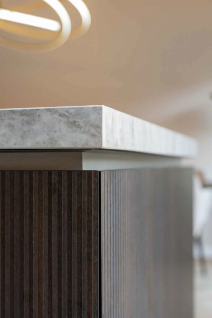 Het nieuwe ontwerp begon met één duidelijk idee. “Ik vind een keukeiland gewoon heel erg leuk”, zegt Shirley. “En dat wilden we sowieso graag.” De stijl van de keuken ontstond vanuit een materiaalkeuze die meteen de toon zette. “Ik had een blad bij iemand gezien, en dat vond ik zo’n mooi blad. Daar zijn we eigenlijk op verder gaan bouwen in de kleurstijlen.”