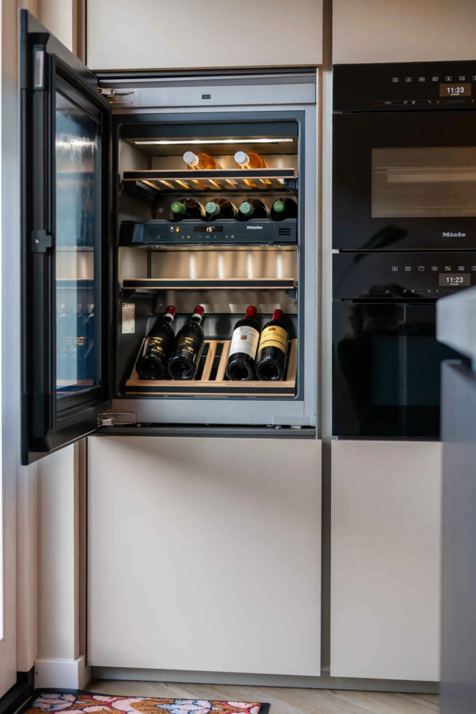 Veel apparatuur waren gebaseerd op hun vorige keuken. “In het oude huis hadden we bijvoorbeeld ook een stoomoven, oven en een grote koelkast”, vertelt Shirley. Dyon voegde één belangrijke wens toe: “Mijn vriend wilde heel graag als toevoeging een wijnkoelkast.”